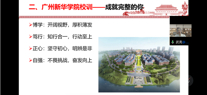 讲课中,他从广州新华学院校训“博学、笃行、正心、自强”出发,结合中华优秀传统文化经典,阐释校训的精神实质与时代价值。他指出,校训是一所大学的精神基因,承载着学校的价值追求与育人传统,引导学生“学什么、怎么学、如何做人”。