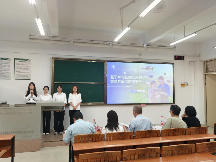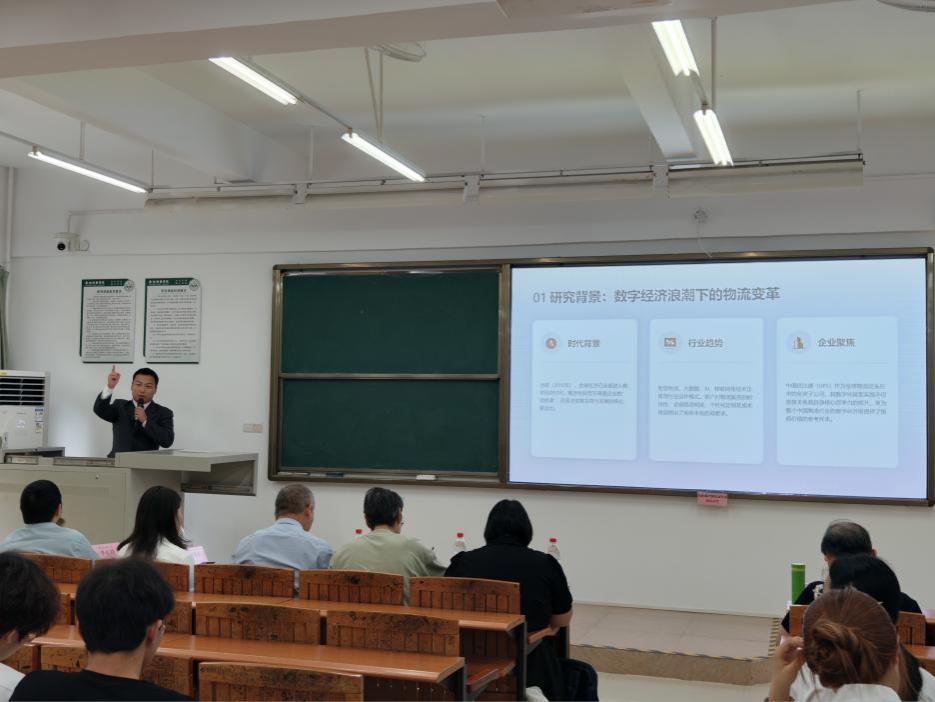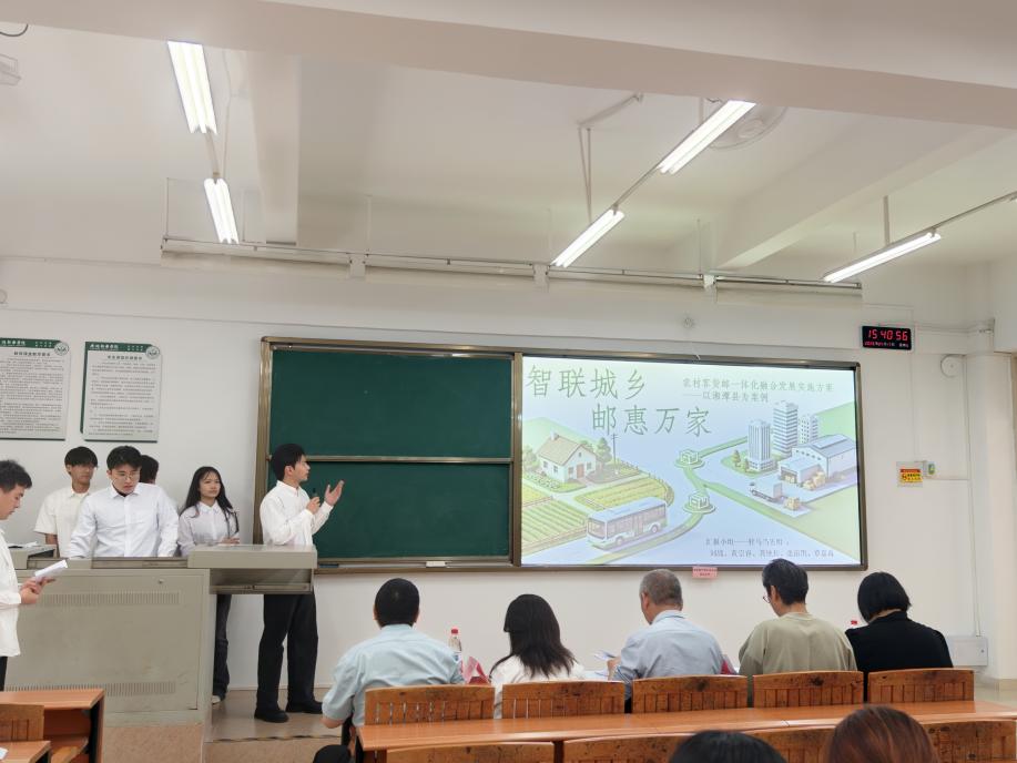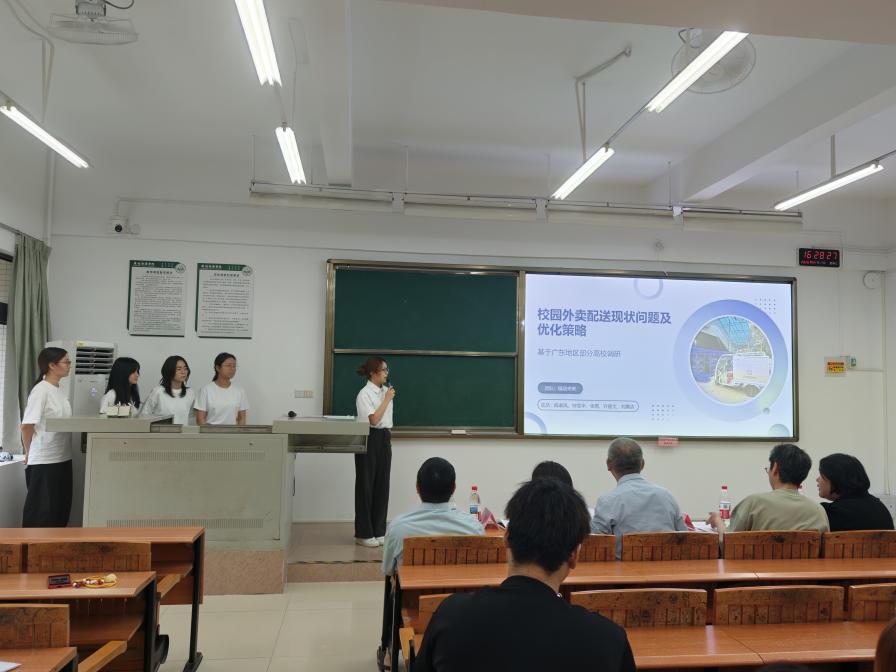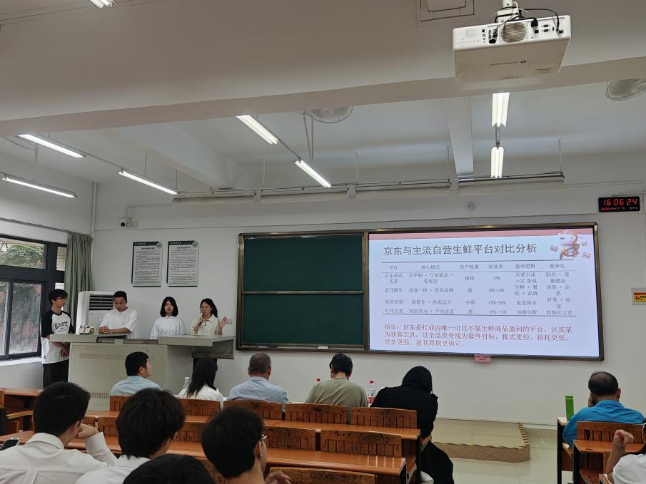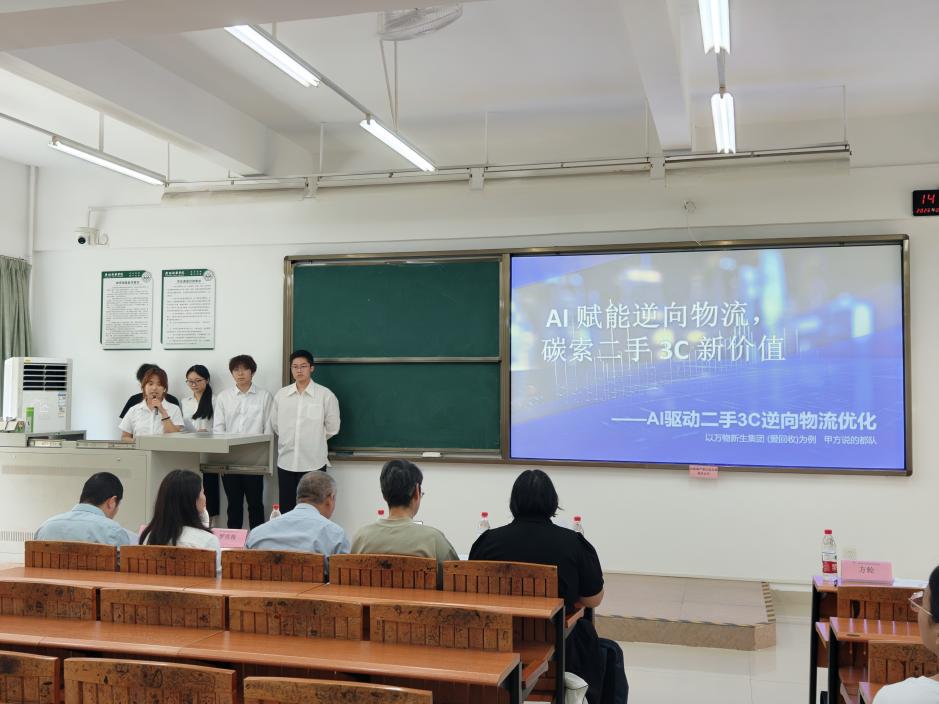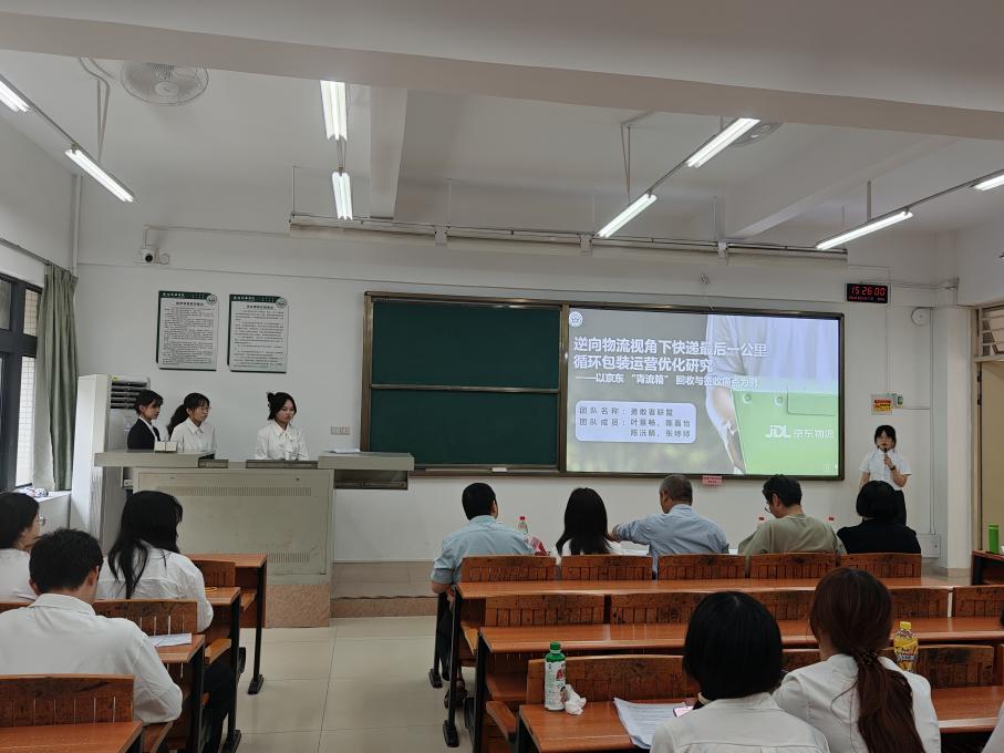 随后,八支参赛队伍依次登场,按照10分钟项目汇报+5分钟答辩的规则展开角逐。各团队聚焦汽配零售库存、二手3C逆向物流、乡村智慧共配、农村客货邮融合、循环包装运营、校园外卖配送等前沿课题,通过精心制作的PPT,条理清晰地阐述项目调研成果、创新思路与解决方案。在面对评委提问时,选手们从容应对、逻辑缜密,充分展现了专业功底与临场应变能力。五位评委老师也从项目可行性、创新点、调研深度等维度进行专业点评,既肯定了各团队的用心付出与亮眼创意,也针对项目不足提出具体优化建议,为后续成果完善指明方向。