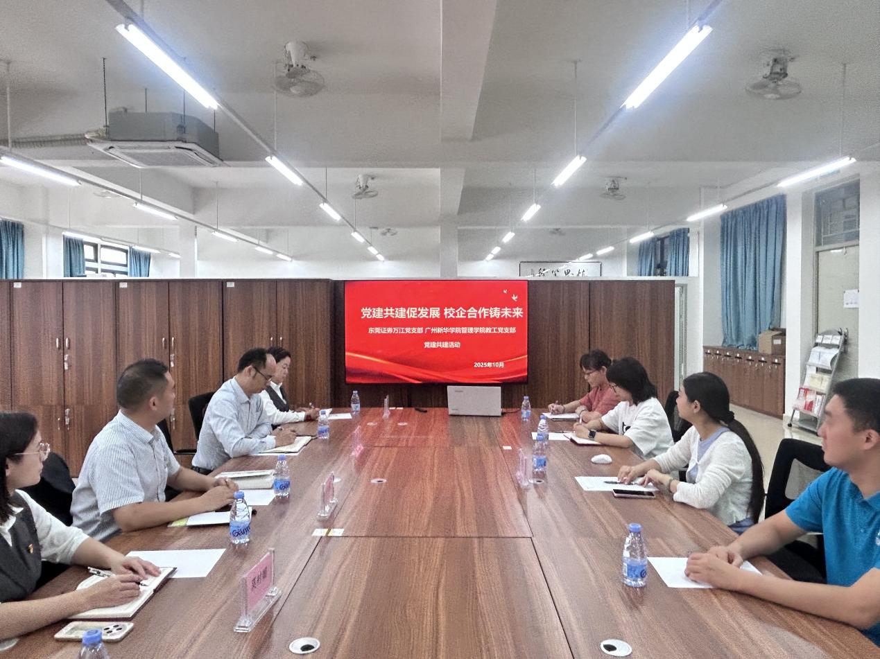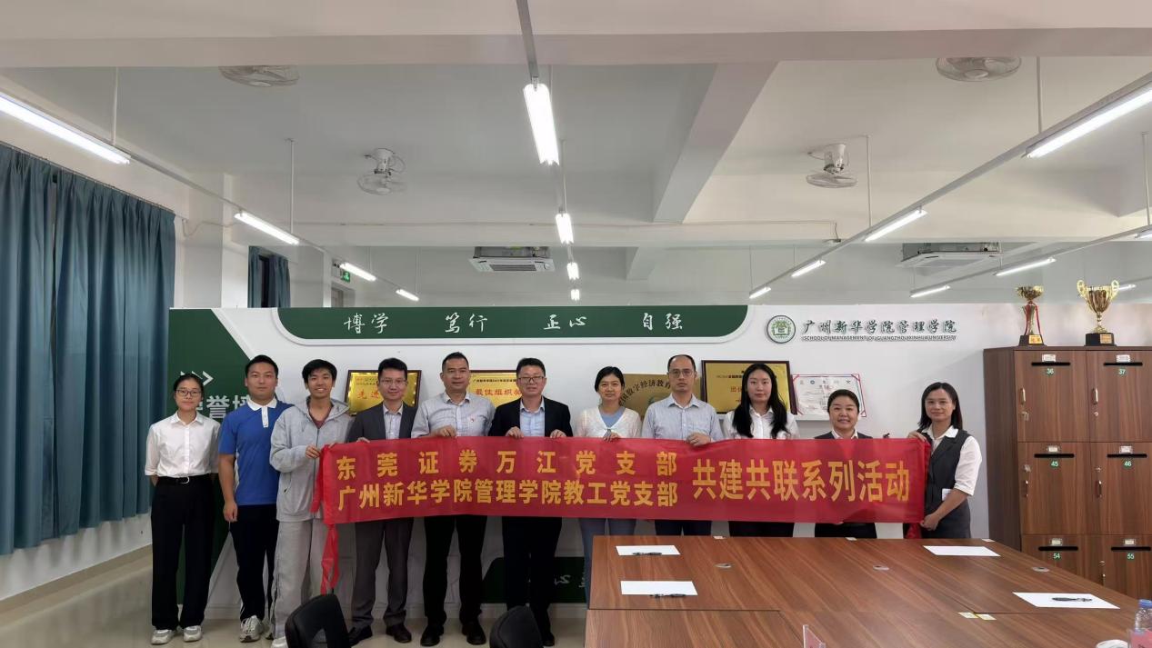 为加强党支部间的学习交流,促进校企合作,10月27日,管理学院教工党支部邀请东莞证券万江党支部到我支部开展交流学习,东莞证券万江营业部总经理助理陈炽球、总经理助理殷志明、党务专员胡悦雯、合规专员莫衬媚及相关同志,我院院长助理兼办公室主任、教工党支部副书记胡巧云及党支部成员参加此次共建活动。